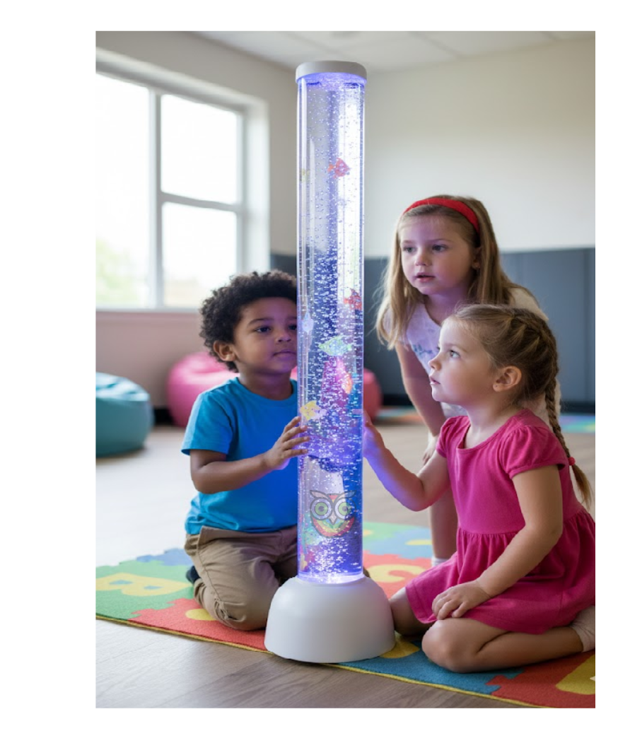 Extra informatie: Bubbelbuis 105 cm – Wit Snoezellamp met Kleurwisselverlichting, Bubbels & Zwemmende Vissen – Perfect voor Sensorische Ruimtes en Klassen