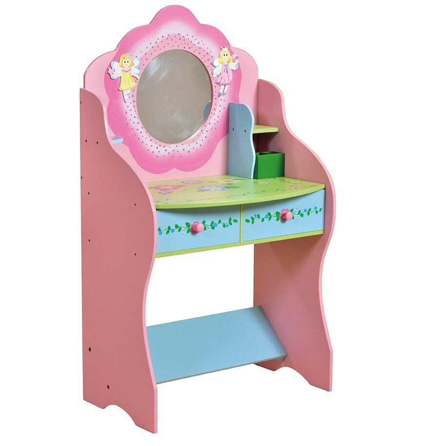 Fairy Kaptafel met stoel in mooie pastel roze kleuren. Mooie feeën en bloemen sieren dit handige meubel. Perfect voor je kleine feeën om zich voor te bereiden op een drukke dag spelen of naar school gaan. Handgeschilderde details. Vereist montage