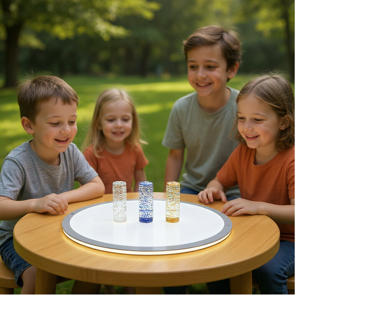 Wanneer de flessen worden omgedraaid of geschud, ontstaat een wervelende glitterstorm die langzaam tot rust komt. Dit fascinerende effect helpt kinderen om te ontspannen, te focussen en bewust te observeren. Ideaal voor rustige momenten, prikkelarme hoeken en sensorische pauzes.
