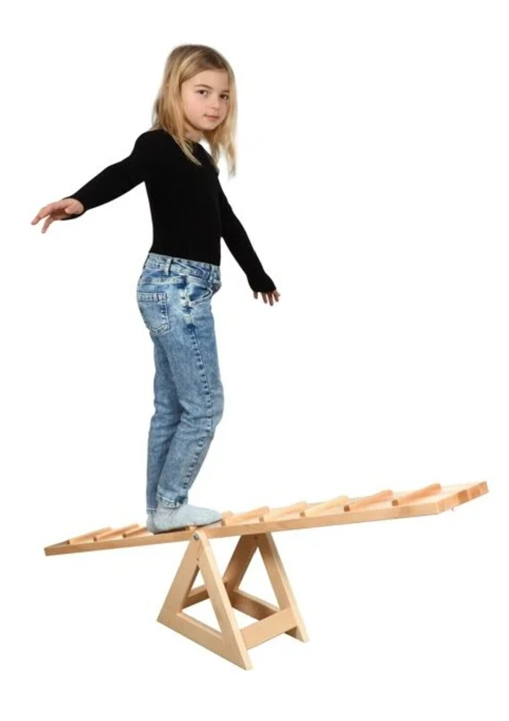 Concentratie is hier vereist! Tijdens de eerste pogingen om over deze rocker te lopen, is een vasthoudende hand een betrouwbare ondersteuning. Pas als kinderen een basisgevoel hebben voor het kantelmoment van de wip, is het een veilige uitdaging om er handsfree overheen te lopen. Ook onder de sneakers bieden de opgeschroefde sporten optimale veiligheid. Over deze wip heen rennen bevordert niet alleen de coördinatie, maar ook het zelfvertrouwen.