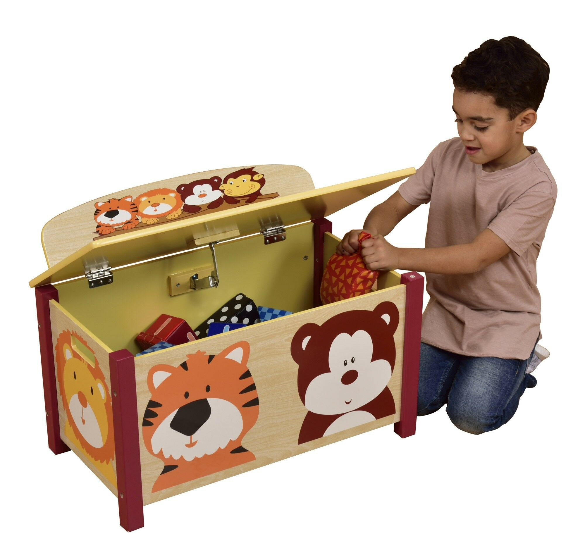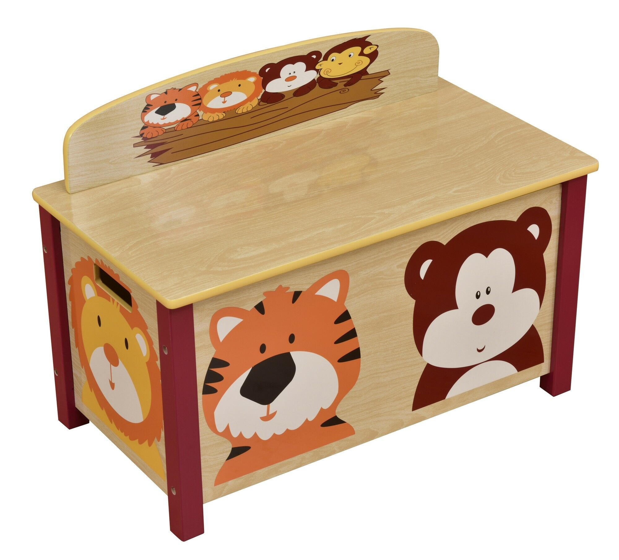 Stevige en kleurrijke grote speelgoedkist. Vriendelijke leeuwen-, aap-, beer- en tijgerkarakters versieren deze nuttige grote speelgoedkist.