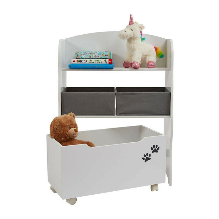 - Middelste plank: Inclusief twee stoffen opbergbakken met handgrepen, perfect voor klein speelgoed, knutselspullen of bouwstenen.