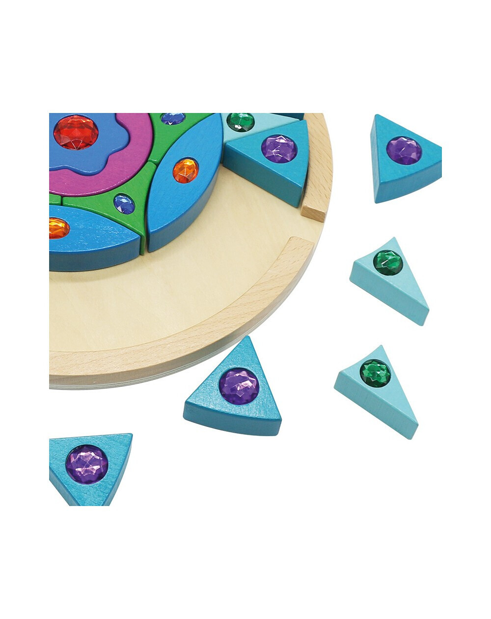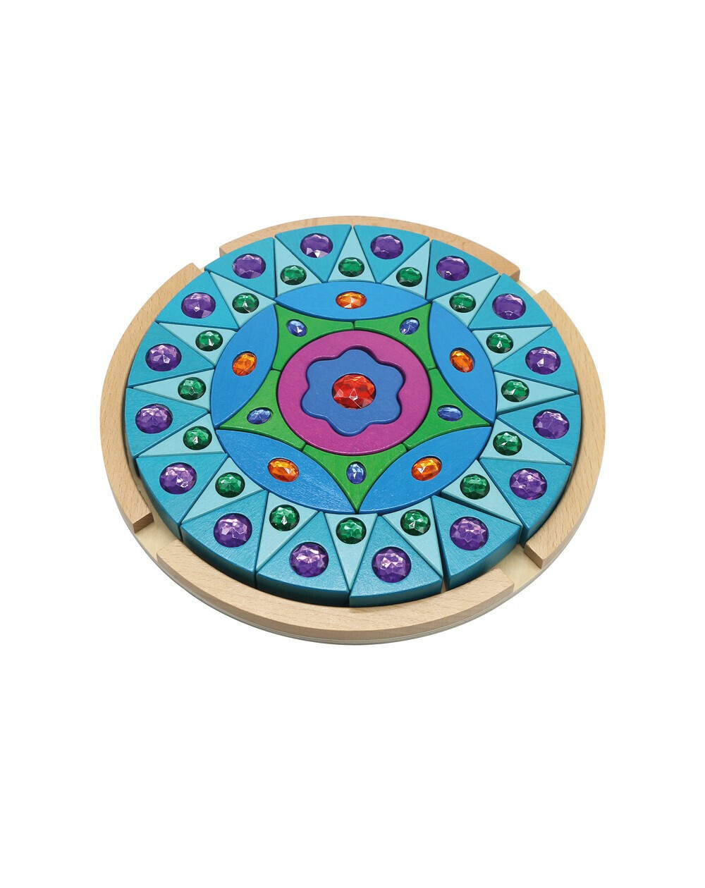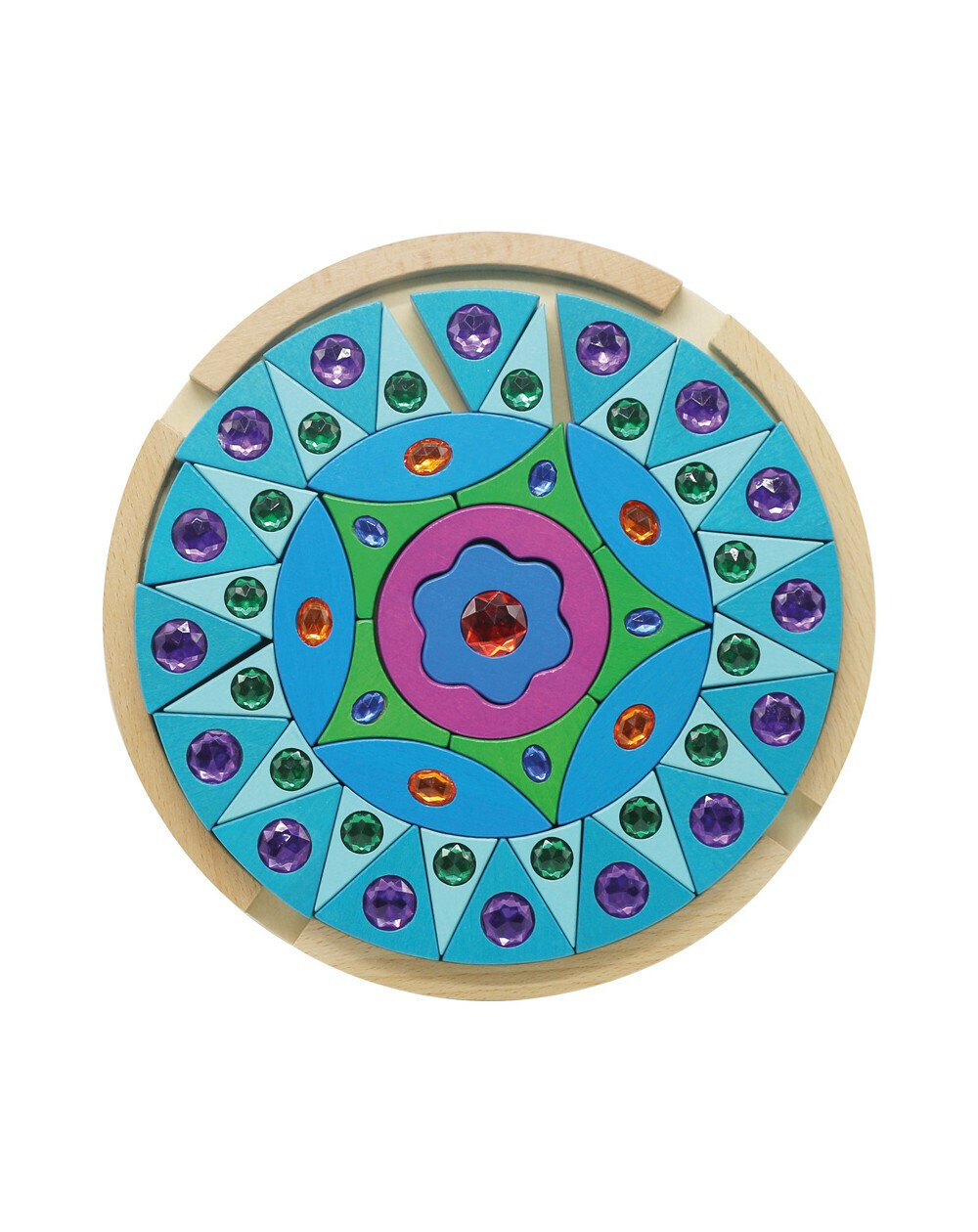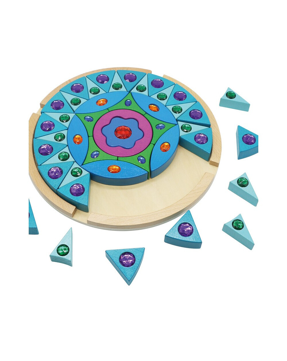 Gekleurde houten mandala met inzetstukken van gekleurde edelstenen. Het verbetert het creatieve vermogen en de mentale functies van concentratie, de oog-handcoördinatie, de waarneming en het verbeeldingsvermogen.