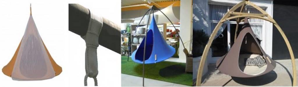 Cacoon heeft veel extra’s klaarliggen om jouw Cacoon aan te passen naar eigen wens: muggennet, deurt, boomlus en houten of metalen standaard.