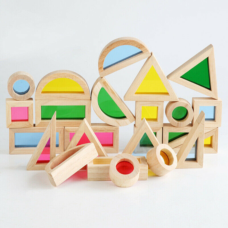 24 rubberwood blokken in 6 vormen en met 4 verschillende transparant gekleurde acryl inzetstukken voor bouwen, vergelijken, vormherkenning, kleurmenging en voor gebruik op een lichtbak. Deze zijn even groot als de Mirror Block Set (73378) en vormen een natuurlijke uitbreiding op deze set.
