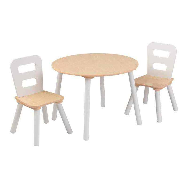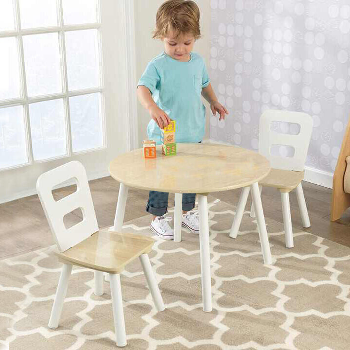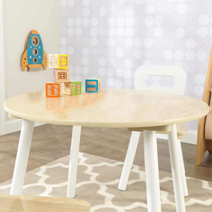 Het moderne ronde tafelblad is voorzien van een krasbestendig en kindvriendelijk gelakt oppervlak, gemakkelijk schoon te maken en duurzaam. De witte en natuurlijke houtkleuren passen perfect bij elke kinderkamer of speelruimte. Inclusief slagvaste houten poten voor extra stabiliteit en veiligheid. Wordt geleverd met 2 stoelen, zodat je kleintje altijd gezelschap heeft.