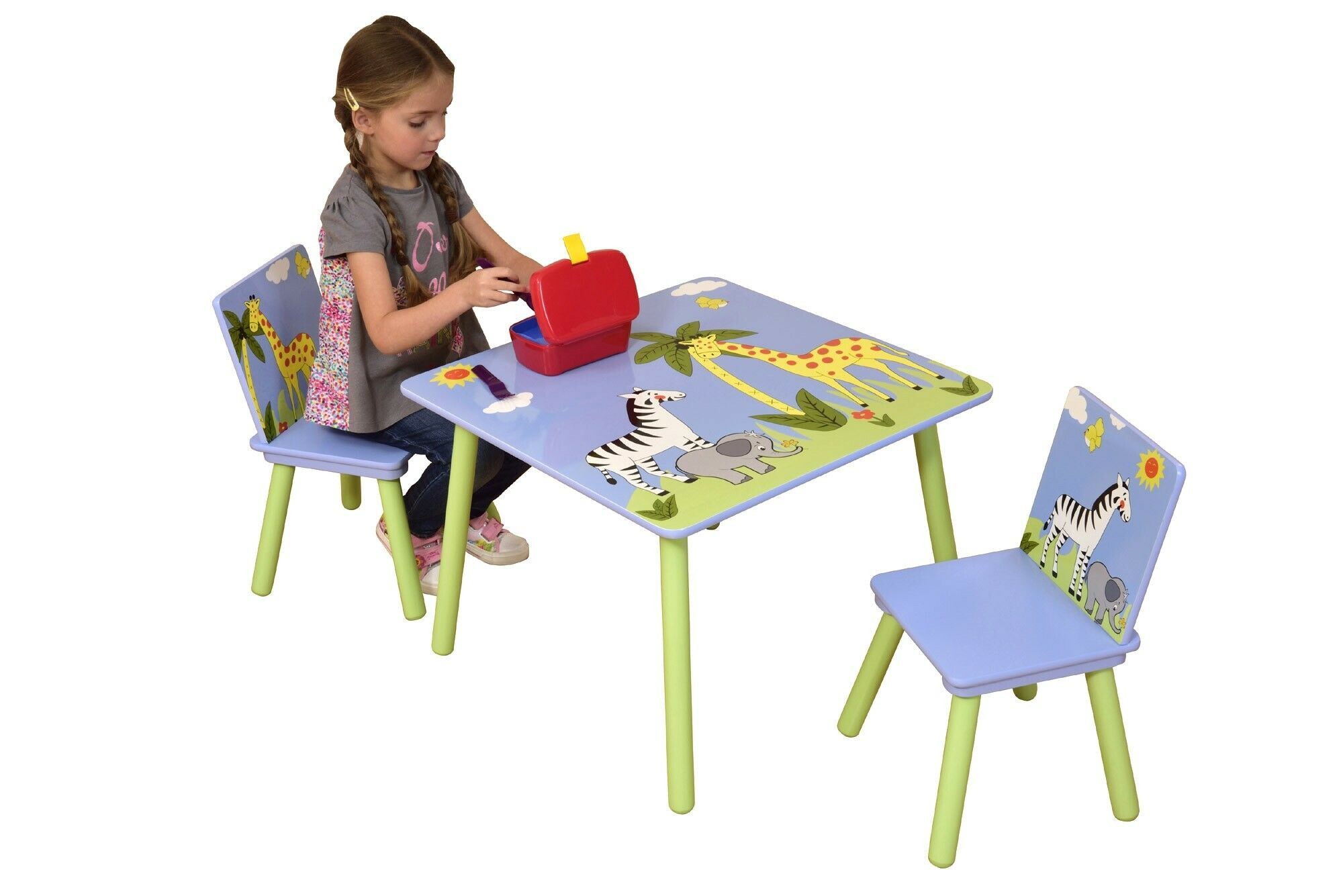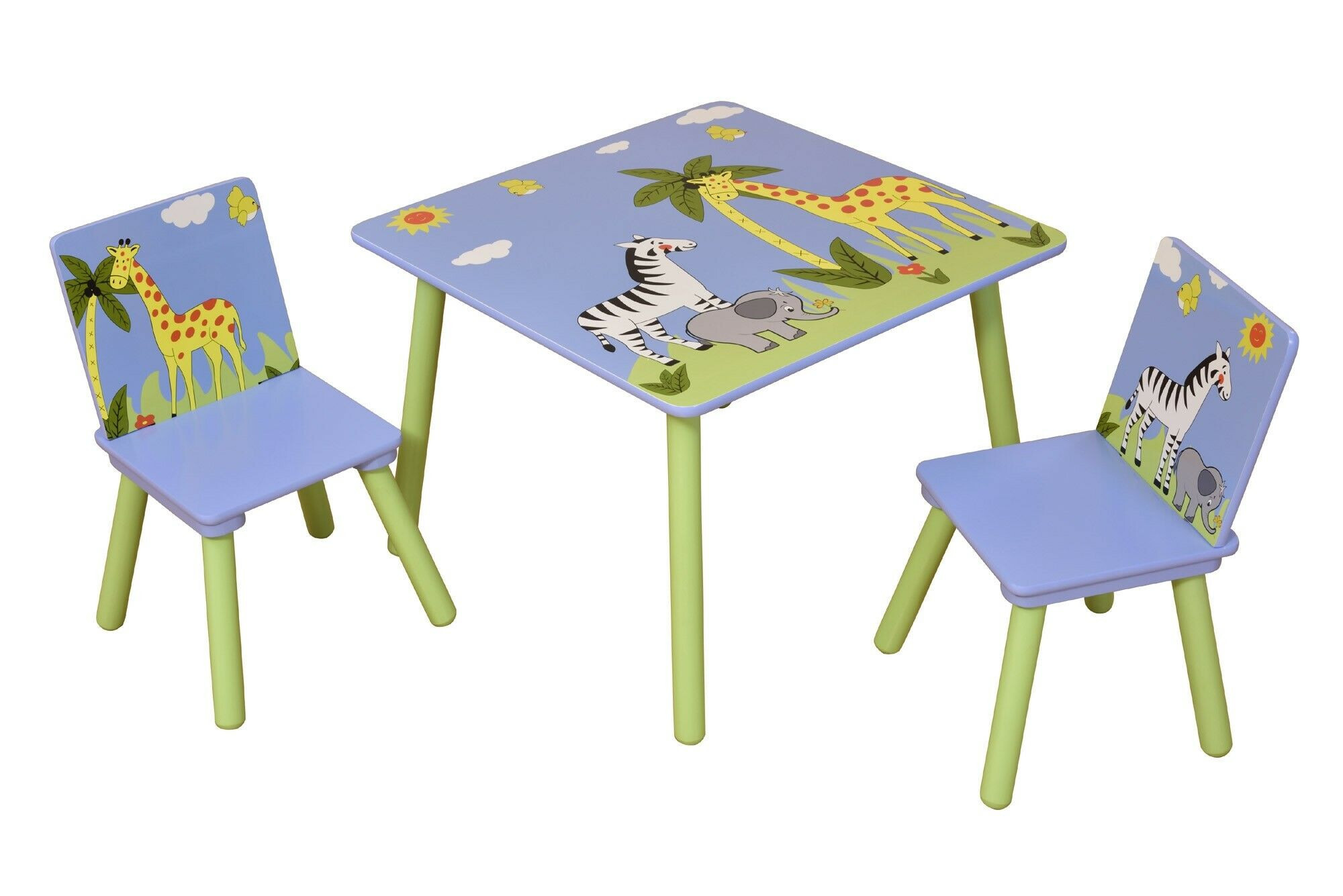 Stevige en kleurrijke tafel met 2 stoelen. Maak een wandeling over de zonnige savanne met onze vriendelijke giraffen, zebra's en babyolifanten. Gelakt tafelblad voor eenvoudige reiniging met een vochtige doek. Plat verpakt geleverd voor eenvoudige montage voor volwassenen. Alle getoonde accessoires zijn niet inbegrepen tenzij anders vermeld. P>