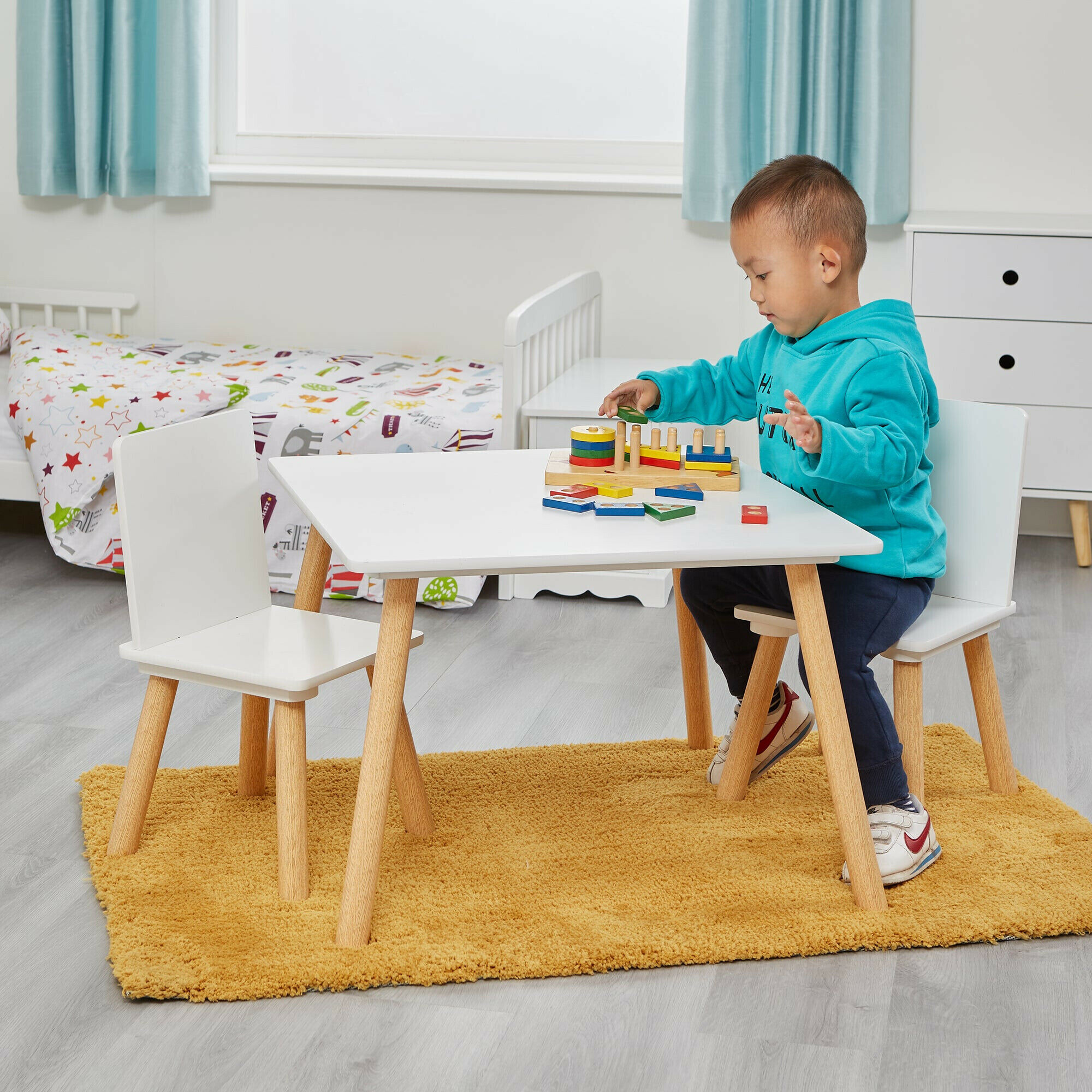Onze witte en grenen tafel- en stoelenset voor kinderen is een moderne tafel en stoelenset van perfect formaat voor uw kleintjes. Uw kinderen kunnen aan hun eigen tafel genieten van knutselen, lezen, spelletjes, snacks en theekransjes. Ook ideaal om te genieten van een hapje of een picknick met vrienden – een platform voor het ontwikkelen van sociale vaardigheden.