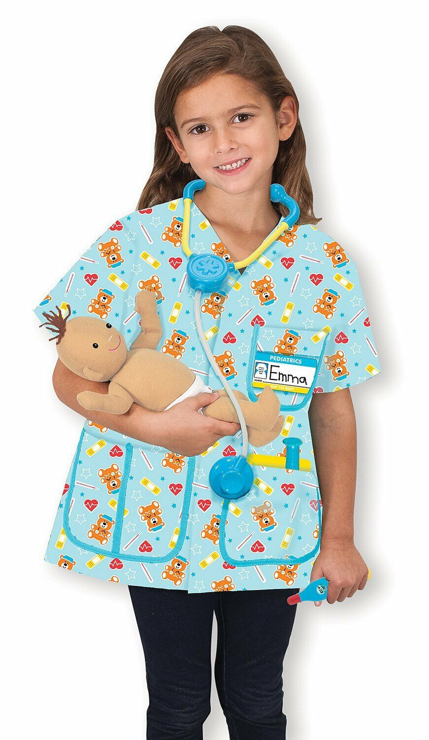 Inhoud: Verpleegsterjas, babypop met luier, stethoscoop, thermometer, otoscoop, injectiespuit