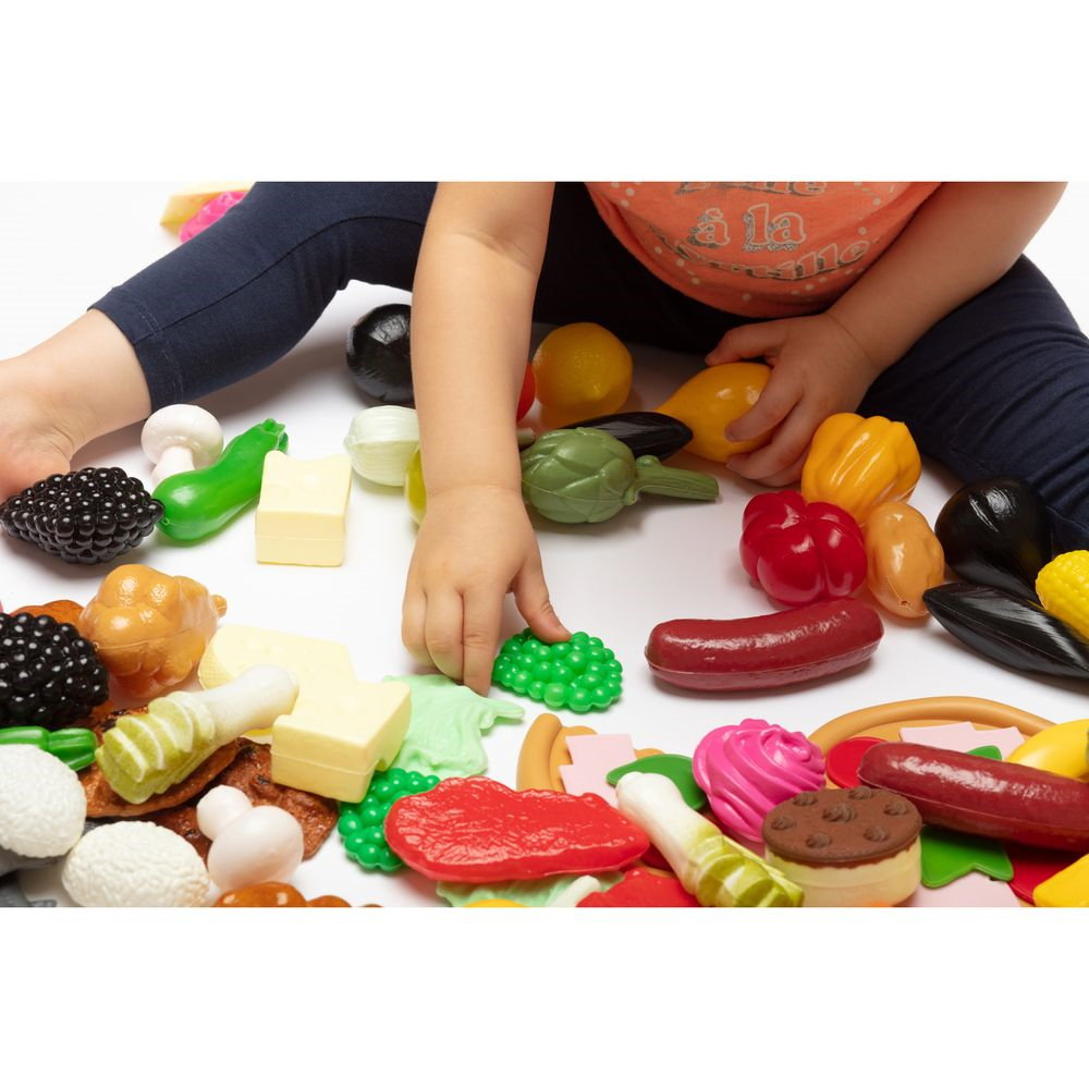 Met deze 114-delige voedselset kunnen kinderen op een speelse manier kennismaken met verschillende soorten eten! De set bevat een gevarieerde selectie van fruit, groenten, paddenstoelen, brood, vlees, vis en zuivelproducten – alles wat we dagelijks consumeren.