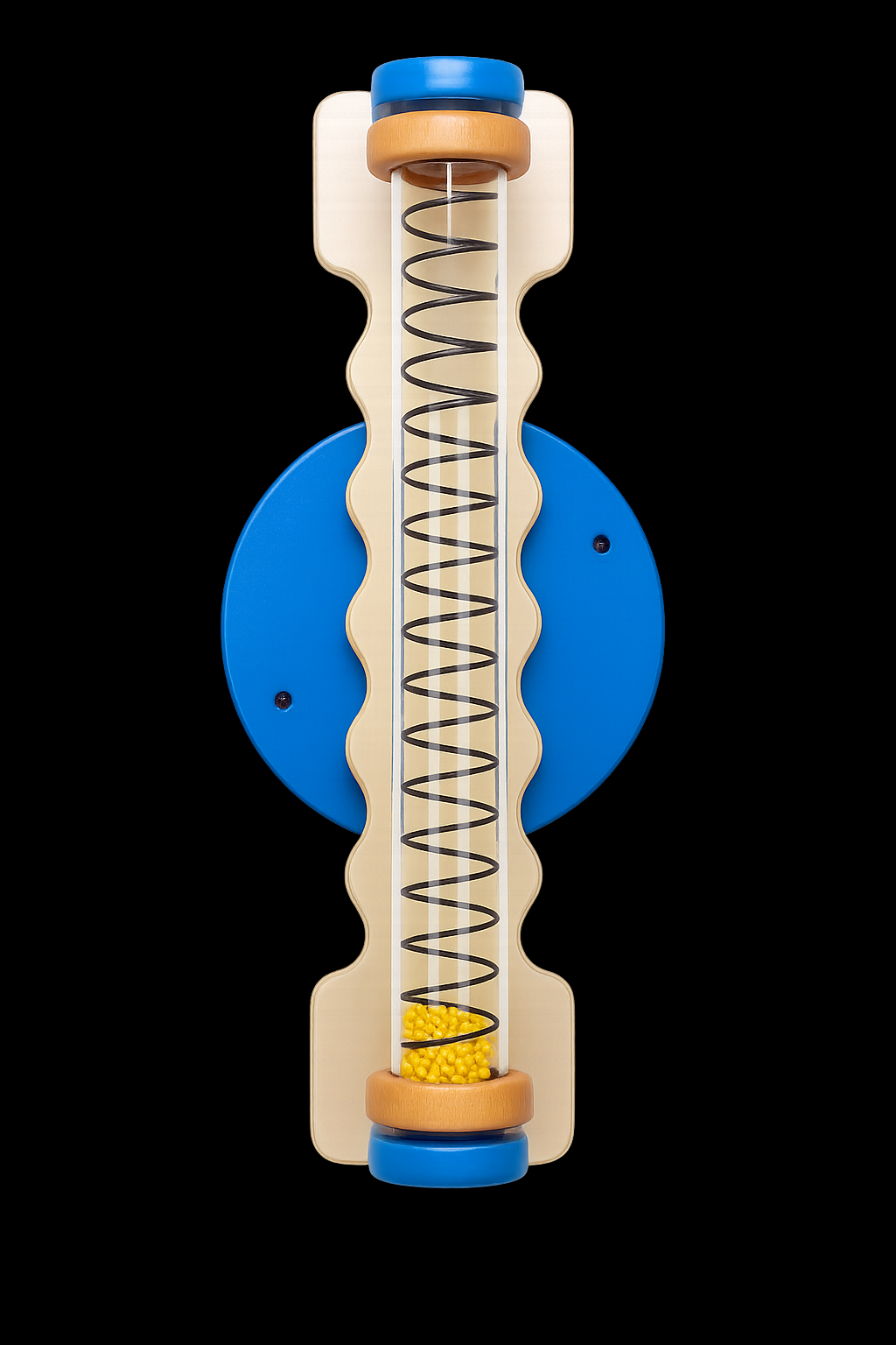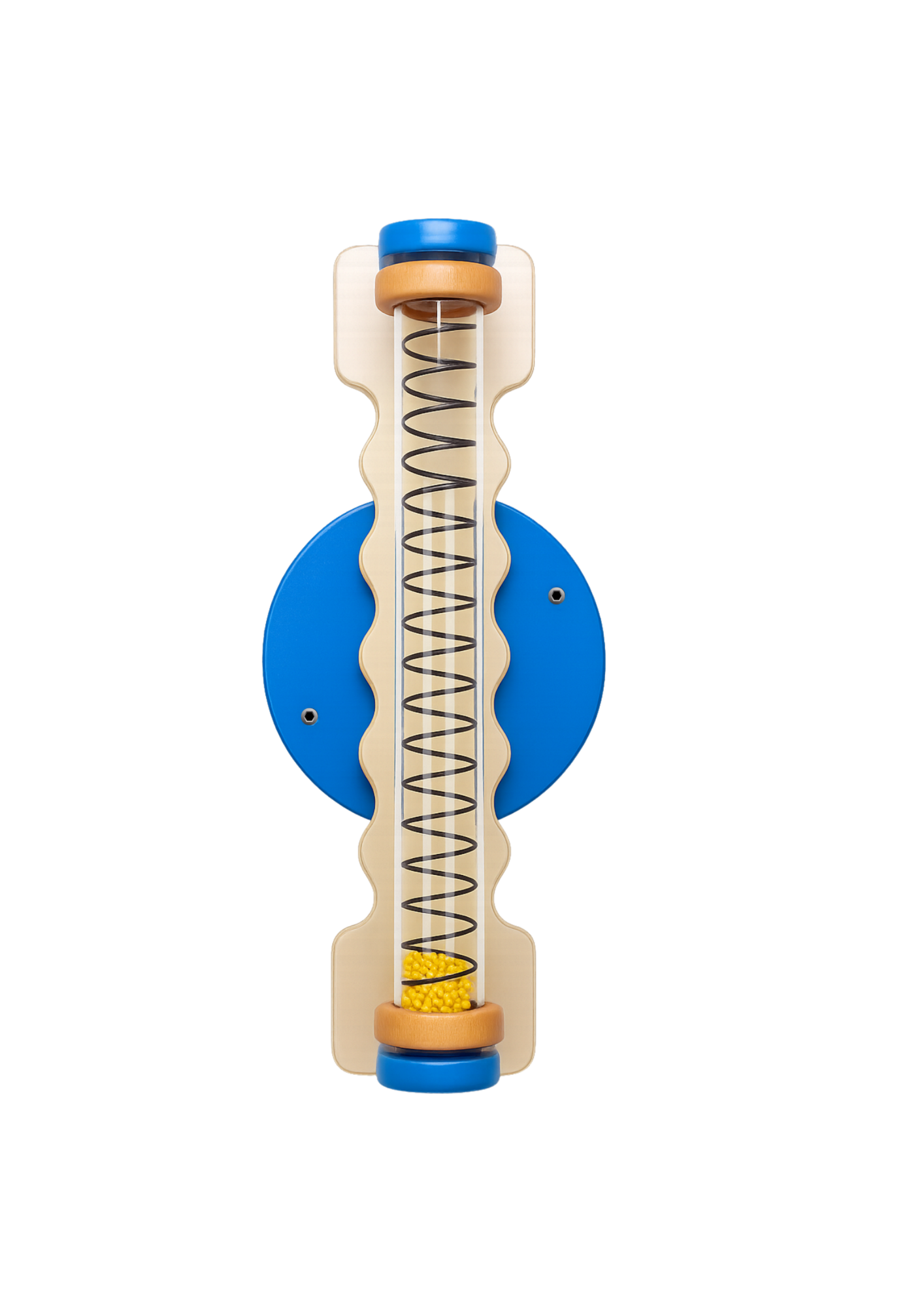 Het Wandpaneel Draai-Veer Blauw is een fascinerend sensorisch wandspel dat kinderen stimuleert om te ontdekken, observeren en bewegen. In de transparante plexiglas buis bevindt zich een metalen spiraal met kleine plastic kralen die langzaam naar beneden ritselen wanneer de buis wordt gedraaid. Dit creëert een kalmerend visueel en auditief effect dat de zintuigen prikkelt.