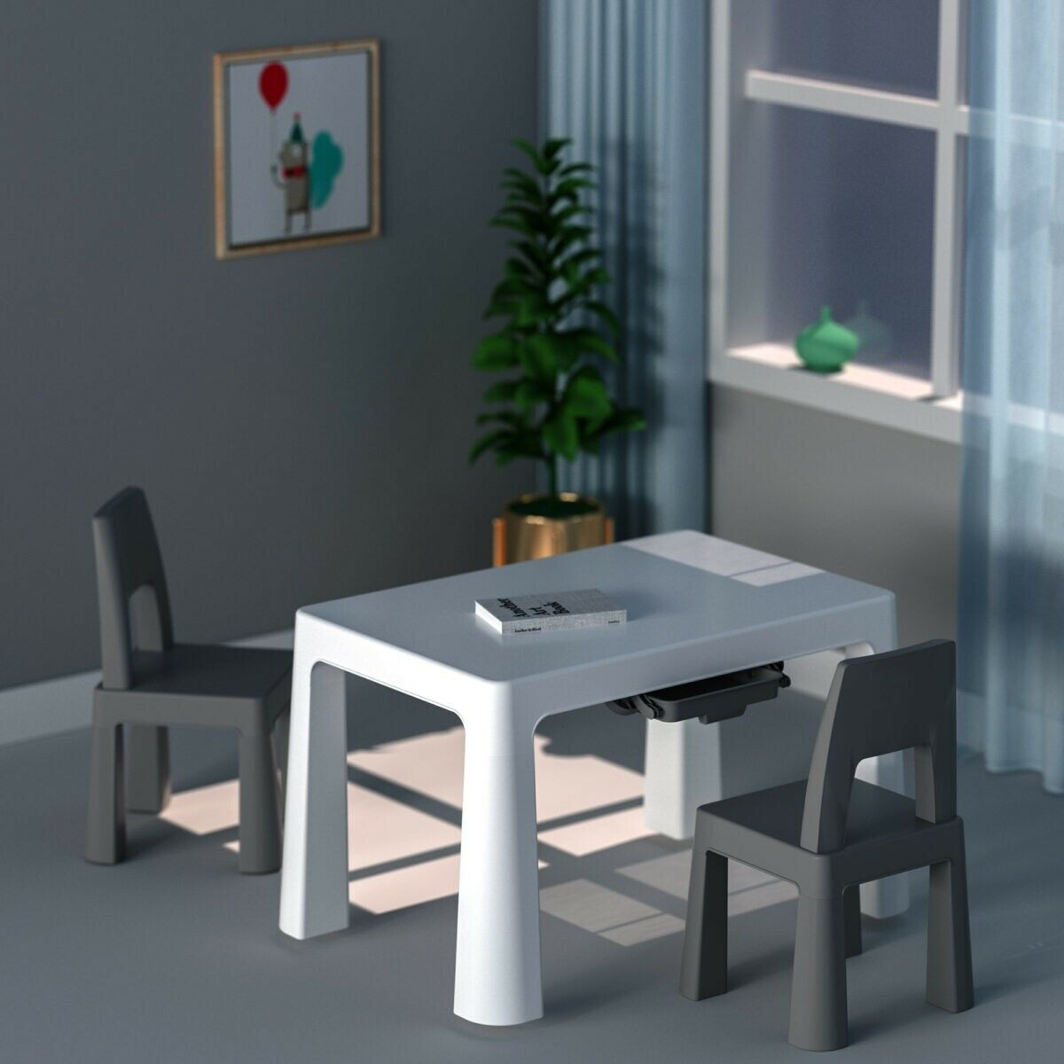 Deze witte en grijze kindertafel met 2 stoelen is perfect voor kinderen van 2 tot 8 jaar. De in hoogte verstelbare tafel biedt comfort en ondersteunt een gezonde houding tijdens het groeien, met een verstelbare hoogte van 490 mm tot 540 mm. Het stevige ontwerp draagt tot 100 kg, maar is licht genoeg om gemakkelijk door het huis te verplaatsen. Ideaal voor binnen en buiten, deze tafel en stoelen passen perfect in een slaapkamer, speelkamer of woonkamer. De twee opberglades bieden handige opslag voor speelgoed, pennen en papier. Het antislipontwerp zorgt voor extra veiligheid op houten vloeren of tegels. Gemakkelijk te monteren met duidelijke instructies, vervaardigd uit geurvrij gehard polypropyleen. Veilig getest volgens de EN71-normen.