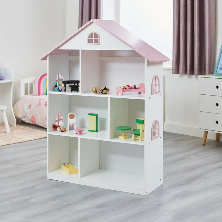 Witte Poppenhuis Boekenkast met Roze Dak – Kinderboekenkast & Opbergruimte voor Speelgoed | Stijlvol & Multifunctioneel